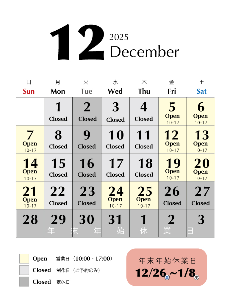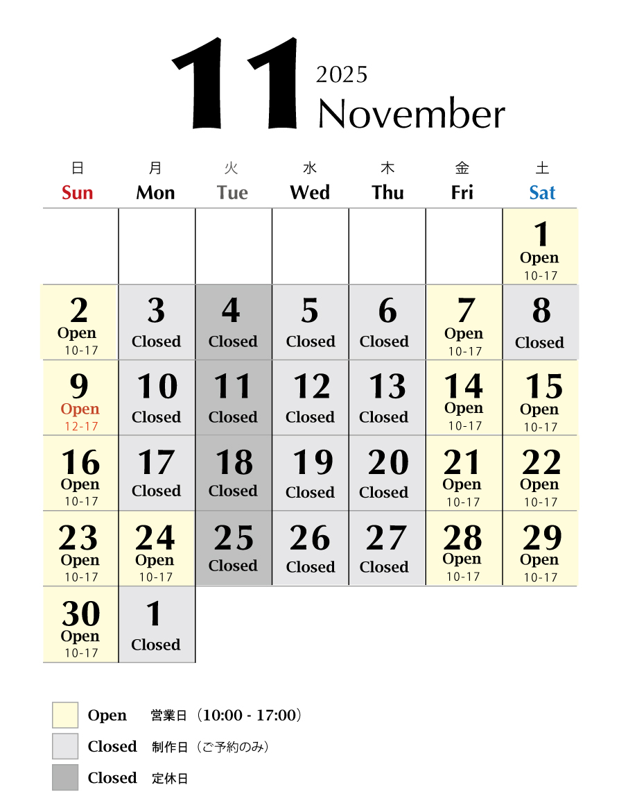 イベント / 営業日程2025.11.02営業日カレンダー 主に*ランタングローブ抽選への応募は予約無しでOK。*グローブのご購入・ご相談は作家対応のため予約制です。*「吹きガラス体験」は行っておりません。*営業日に変更が出る場合もございます。ご了承ください。