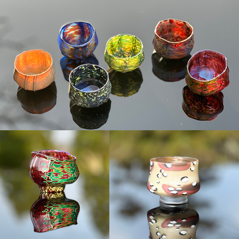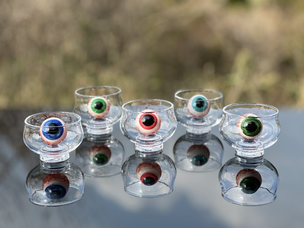 お酒の香り立つ「溺れる目玉杯」各¥33,000(税込)